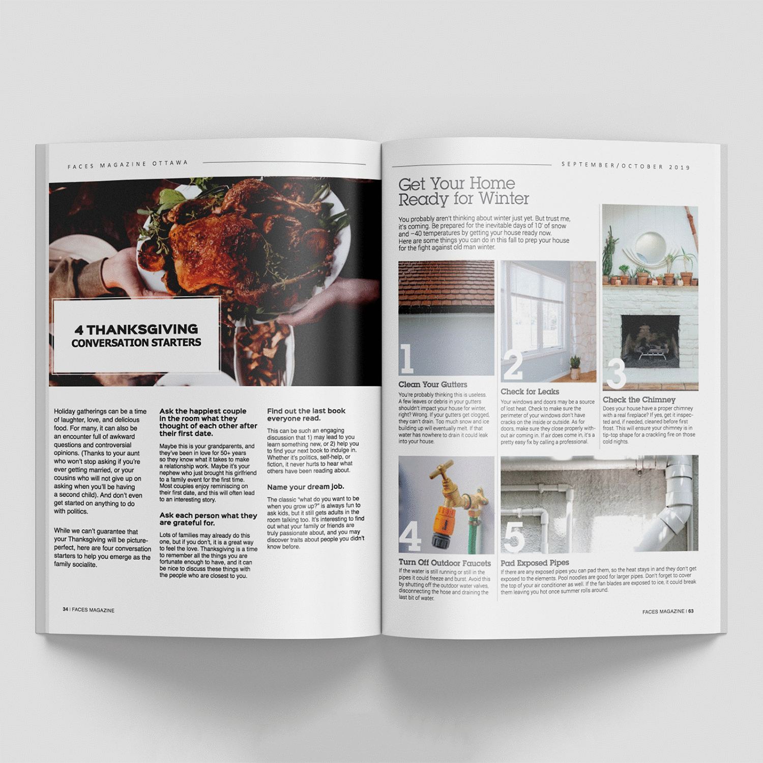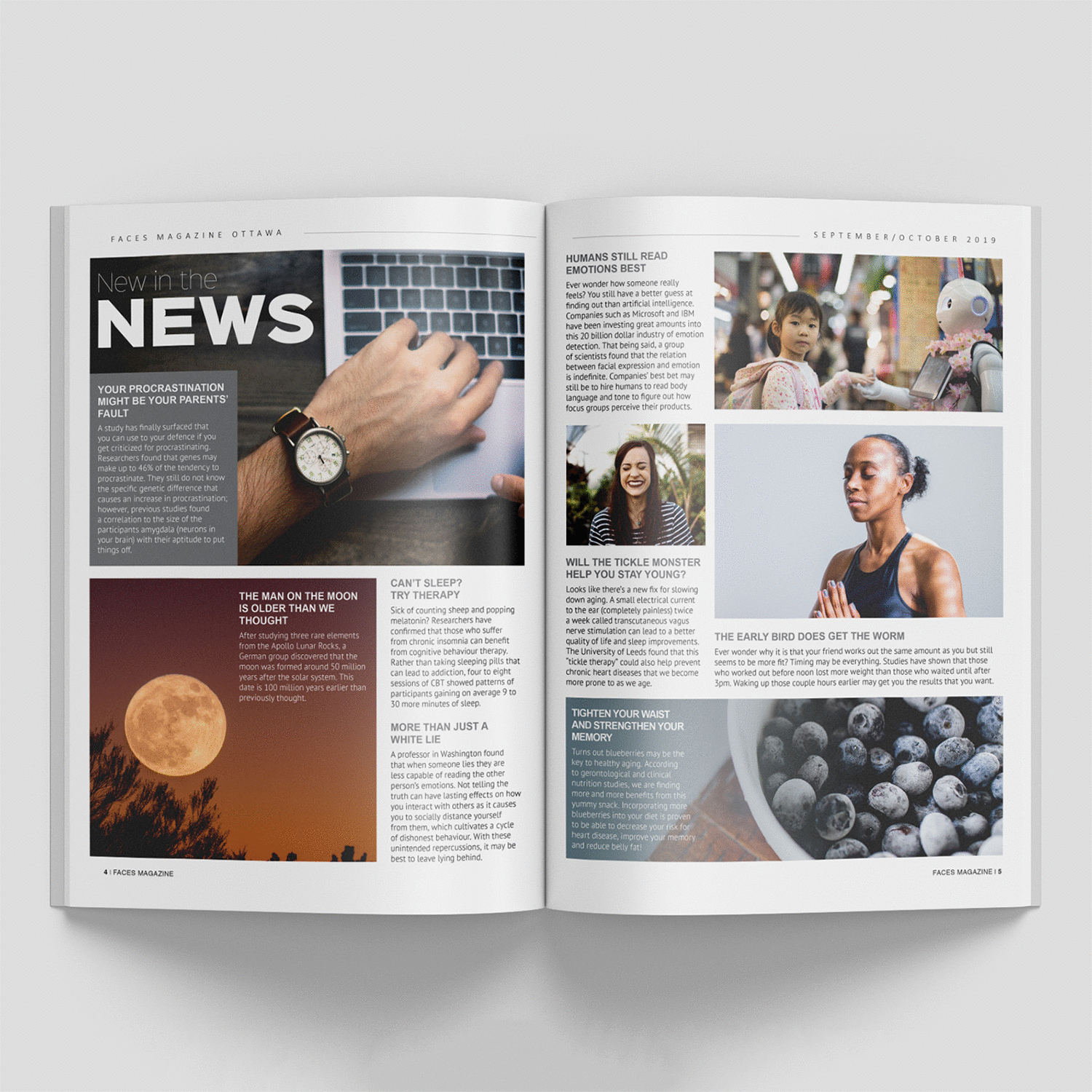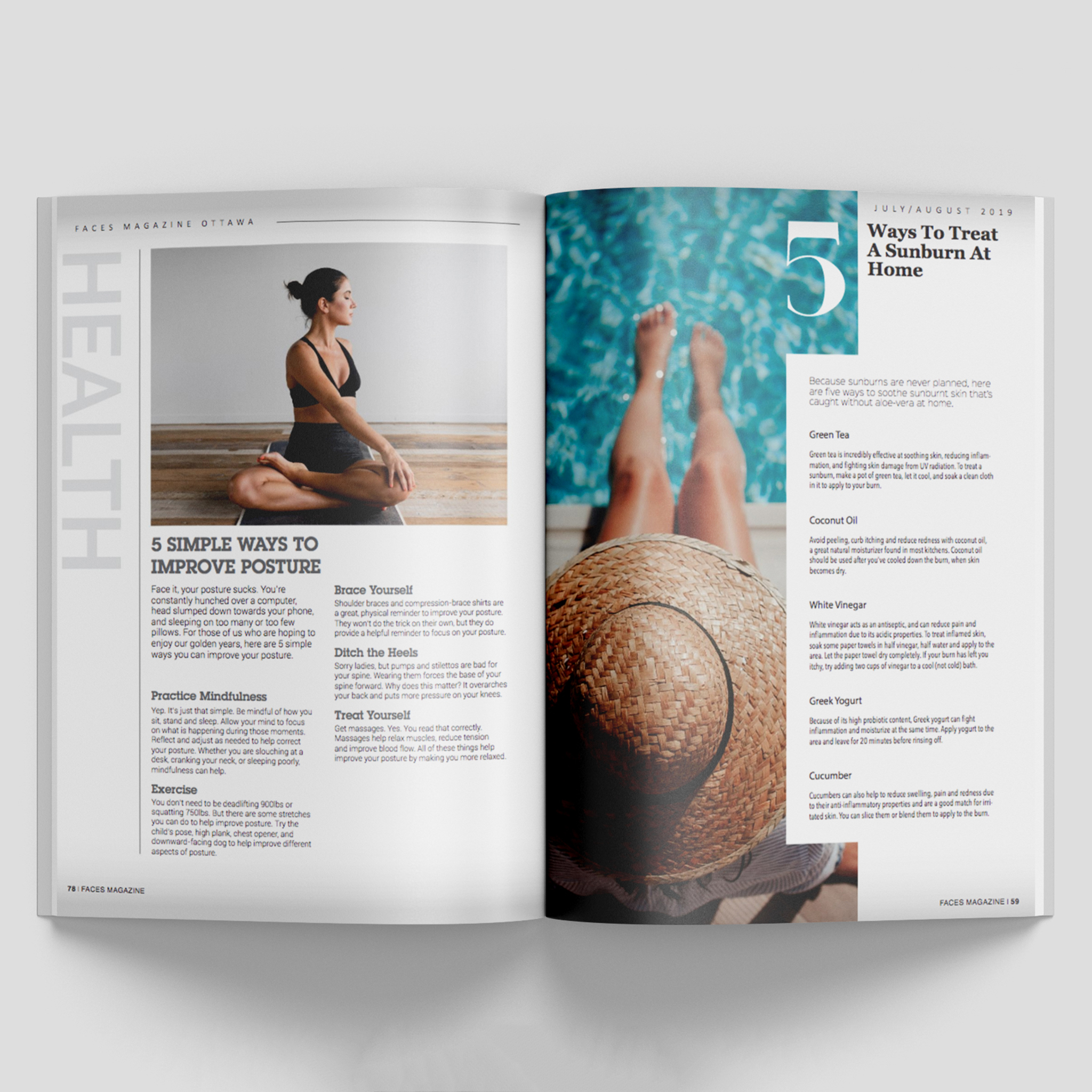 Faces Magazine is a monthly Lifestyle publication that showcases Ottawa’s people, places and events. Each issue is complementary – and features local events, photos from around the city as well as a variety of fashion, health and fitness articles.